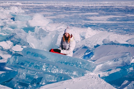 Traveling woman sitting on the blocks of ice. Winter tourism in Russia Baikal Lake. Winter ice along the shore.