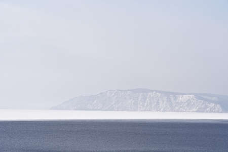 Winter landscape with mountains and Lake Baikal in Siberia on foggy day. Natural background.