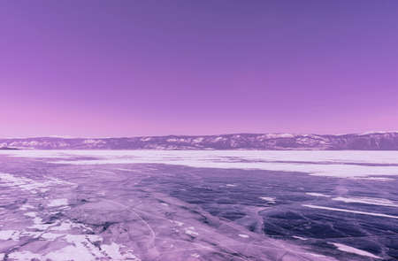 Winter landscape with mountains and cracked ice of Baikal Lake in Siberia. Toned in trendy color. Natural background.