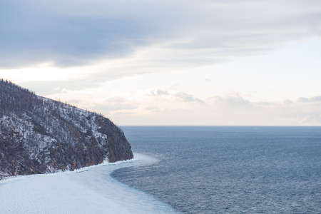 Coast of lake Baikal in winter, the deepest and largest freshwater lake by volume in the world, located in southern Siberia, Russia