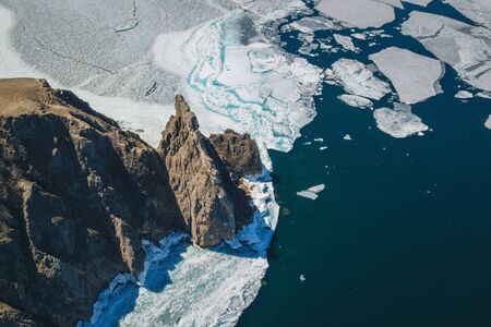 Olkhon Island in early May, rocks and ice of Lake Baikal