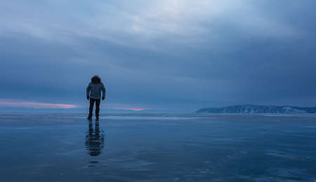 Dusk. The last pink rays of the sun are in the cloudy sky. A lonely man in a down jacket walks along the smooth shiny frozen lake. Reflection on ice. In the distance is a snow-covered mountain. Baikal