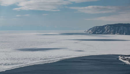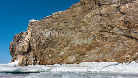 Ice on Lake Baikal in the spring and cliffs of Cape Khoboy