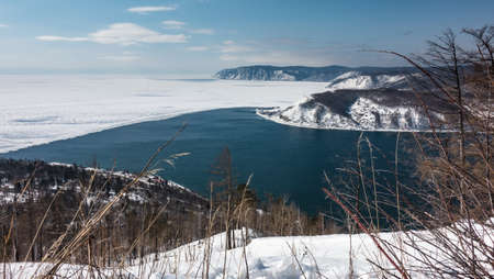 An ice-free river flows out of the frozen lake. The border between white ice and blue water. The mountains are covered with snow. Dry grass in the foreground. Baikal and Angara
