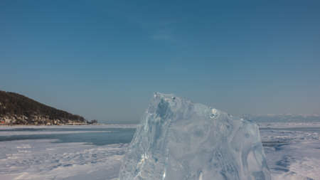A transparent glittering ice floe stands upright on a frozen and snowy lake. Close-up. Mountain range against a clear sky. Sunny winter day. Baikal