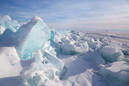 Huge ice blocks, hummocks on the frozen Lake Baikal.