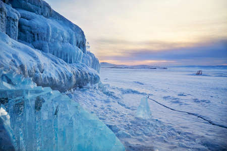 Icy rocks and mountains off the coast of Olkhon Island in winter. Frozen Lake Baikal at sunset.