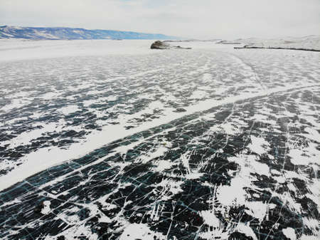 View of the winter frozen lake Baikal from the air. Cars drive along the ice road