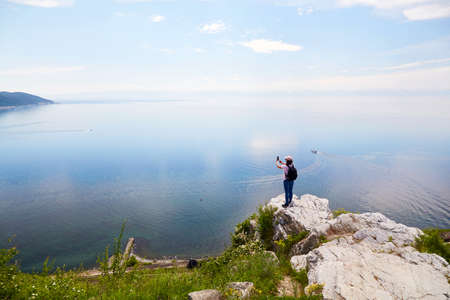 A female traveler stands on a rock and photographs Lake Baikal, the village of Listvyanka on a summer day. The concept of freedom, hiking.