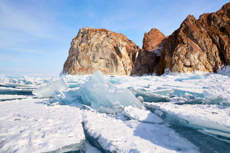 The rock of an unusual shape rises above the frozen lake, against the background of blue sky and mountains. In the foreground are transparent shiny turquoise ice hummocks. Ice floes texture. Baikal