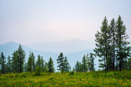 fabulous early morning in the foggy forest. the mountains of Siberia