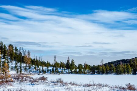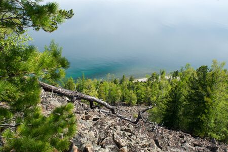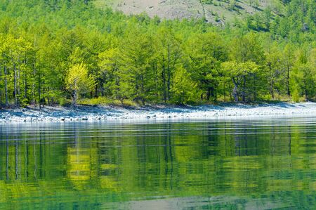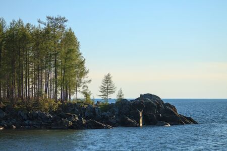 Coniferous trees on shore of lake. Irkutsk region. Russia