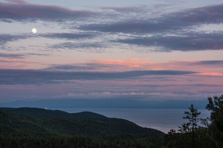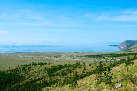 Lake Baikal, tree and mountains of Siberia with beautiful sky and clouds, Russia Oklhon island