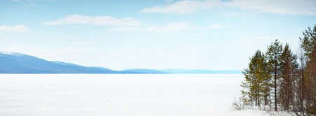 Young pine trees and a frozen lake after a blizzard on a clear day. Mountain peaks in the background. Idyllic winter landscape. Ecology, environment, climate change. Kola Peninsula, Karelia, Russia