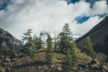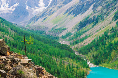 Small larch on stony hill on background of azure mountain lake in valley. Wonderful mountains in sunny day. Conifer forest on mountainside in sunlight. Vivid landscape of majestic nature of highlands.