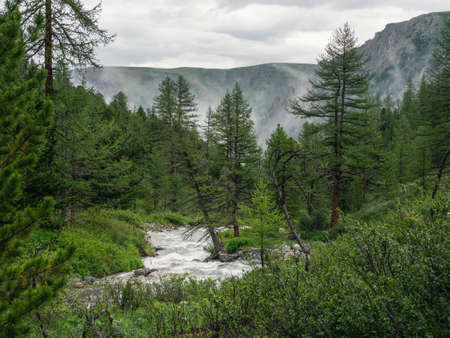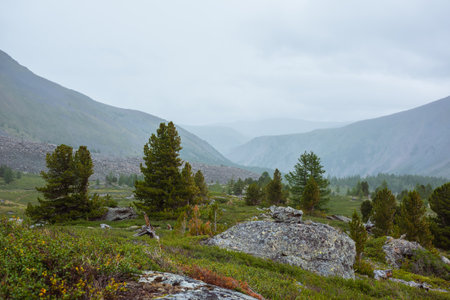 Sparse coniferous trees among big stones and lush flora in alpine valley in rainy weather. Dramatic view to open conifer forest among boulders and thickets on green grassy hill under gray cloudy sky.