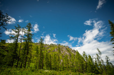 The mountain with snow top among a taiga Mountain Altai Siberia