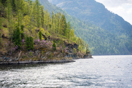 Close view of Teletskoye lake shore with fir trees, blooming rhododendron and rocky cliffs. Wild natural landscape in Altai Russia seen from the water. High quality photo