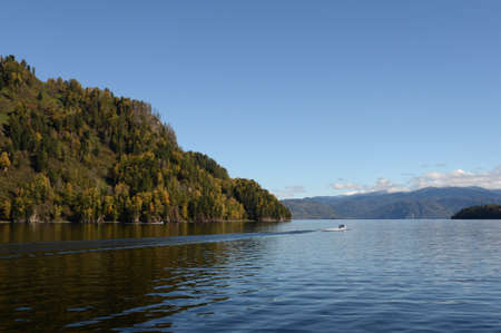 Motor boat near the shore of a mountain lake. Fall. Russia, Altai Republic, Lake Teletskoye