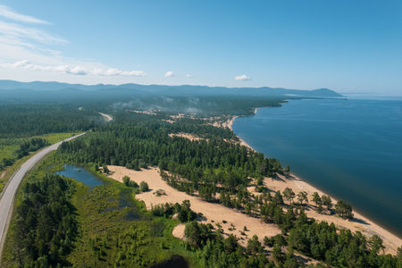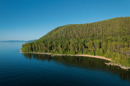 Summertime imagery of Lake Baikal is a rift lake located in southern Siberia, Russia. Baikal lake summer landscape view. Drones Eye View.
