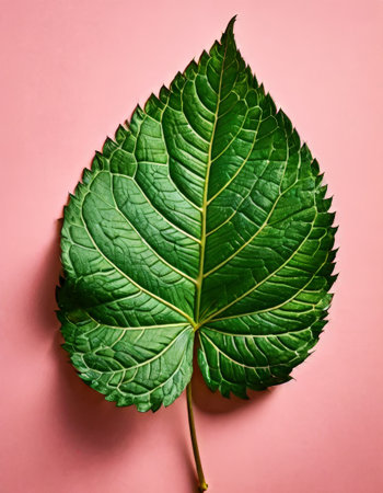 A single vibrant green leaf with intricate veins is placed on a light background, symbolizing nature's beauty and simplicity, ideal for various themes.