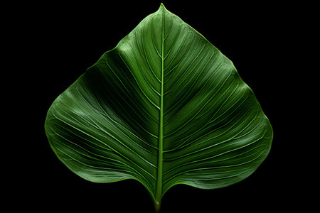 A single vibrant green leaf with clearly defined veins is centrally placed against a stark black background, with light highlighting its intricate texture and...