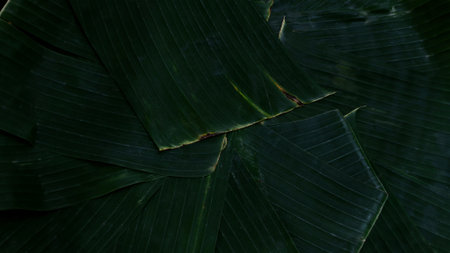 Banana leaves nature background overlapping. Rural pattern wrapping or placing local tropical snacks