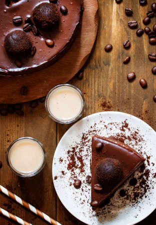 Cheesecake with chocolate and whipped cream on a wooden background.