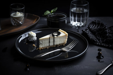 slice of cheesecake on black plate, with silver utensils and glasses, created with generative ai