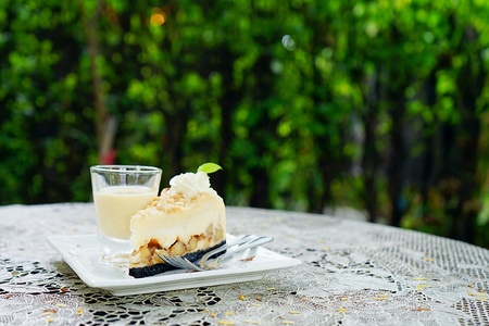 banoffee pie with caramel sauce, green garden background, Blurred background