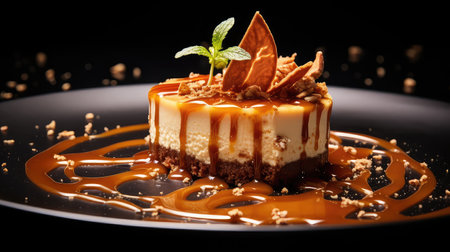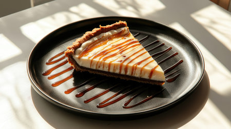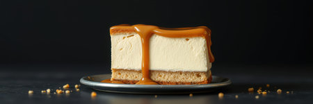 A tempting slice of creamy dessert drizzled with caramel sauce, elegantly placed on a dark plate. Perfect for showcasing in food photography.