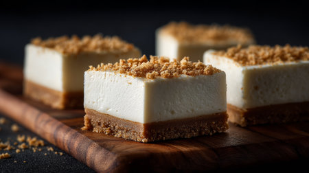 Decadent Dessert: Square Cheesecake Bars with Crumb Topping on Wood Board