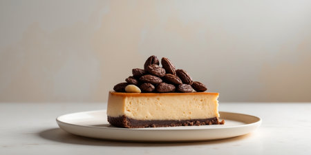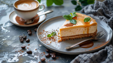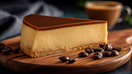Delicious Slice of Cheesecake Topped with Caramel, Served with Coffee Beans