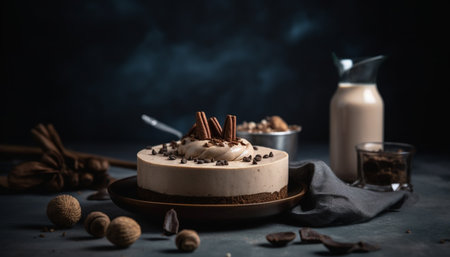 A decadent homemade chocolate cheesecake on rustic wood generated by artificial intelligence