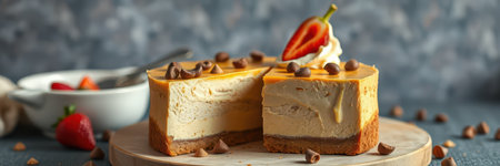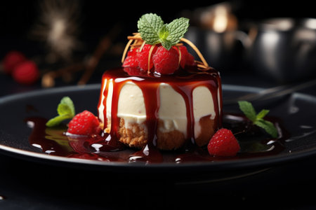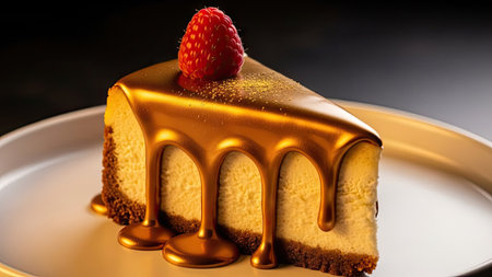 A close-up captures a slice of cheesecake, topped with a glistening caramel sauce and a single raspberry. The image displays a smooth, creamy texture and warm, inviting colors. The lighting emphasizes the details and visual appeal. Ideal for food-related projects, culinary content, or advertising.