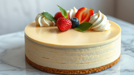 Creamy cheesecake topped with fresh strawberries, blueberries, and mint leaves on a marble table