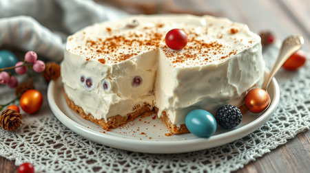 Delicious cream cake with colorful decorations served on a lace doily during a festive gathering in the winter season