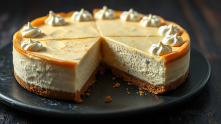 Delicious cheesecake with caramel topping and whipped cream decorations served on a black plate at a cozy dessert setting