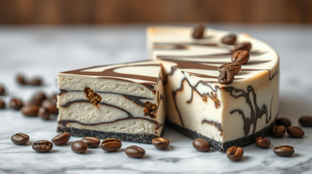 Chocolate marble cheesecake served with coffee beans on a marble table
