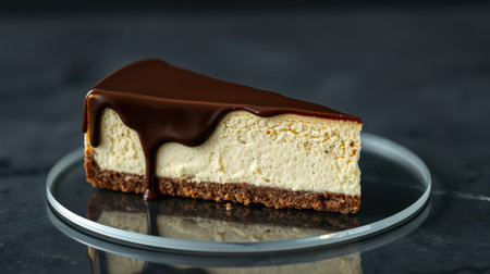 Delicious chocolate-topped cheesecake on a glass plate in a modern setting