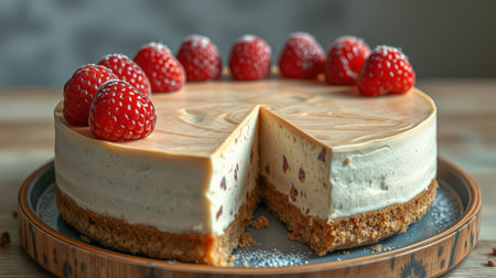 Delicious strawberry cheesecake on a wooden table with a slice removed, perfect for dessert lovers