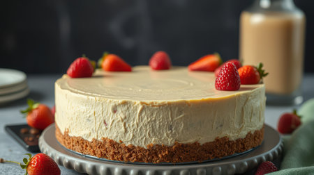 Creamy cheesecake topped with fresh strawberries on a rustic table setting