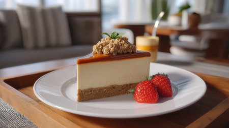 An AI generated illustration of a delicious slice of cheesecake, with strawberries and sweet syrup