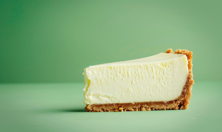 Lemon cheesecake with a graham cracker crust on a light green background