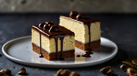 Mouthwatering cheesecake with a rich chocolate ganache topping, served on an elegant white dish