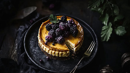 Cheesecake with chocolate flavor is on a plate with blackberries.