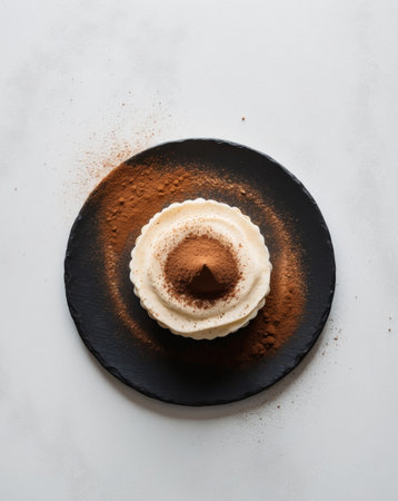 AI Generated. Top view of a serving of tiramisu with a dusting of cocoa powder on a black slate