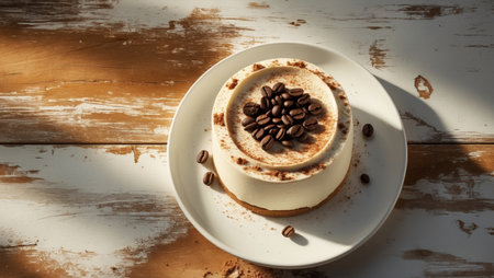 AI Generated. Tiramisu dessert with coffee beans on top presented on rustic wooden background with Copy Space for text