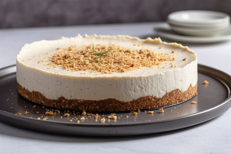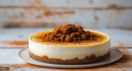 AI Generated. Delicious Round Cheese Cake with Spice Topping on Wooden Background