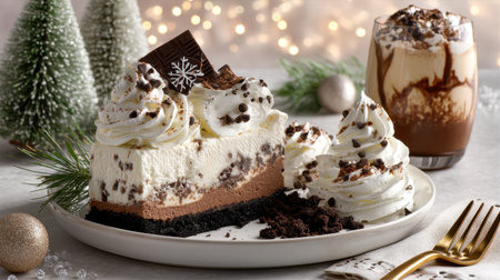 A tempting chocolate mousse cake adorned with whipped cream and chocolate garnishes, served alongside a creamy cocoa beverage amid a festive holiday setting.